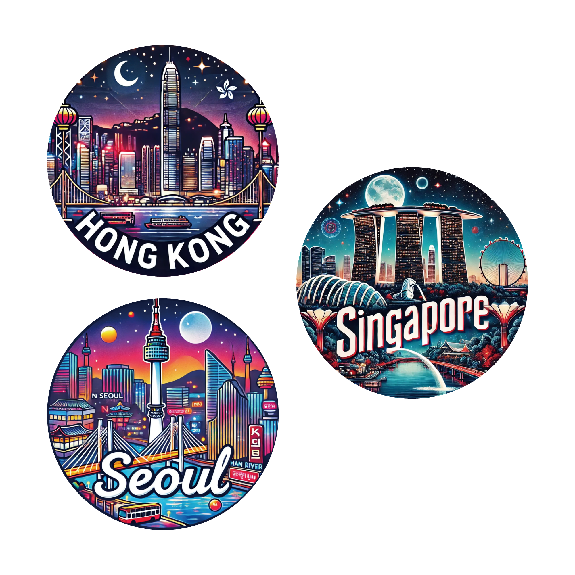 Collect the Iconic Nightscapes of Asia!:Bring the dazzling lights of Asia’s most dynamic cities to your everyday items with this premium 3-pack sticker set. You get three unique, vibrant designs: the futuristic glow of Singapore featuring the Marina Bay Sands and Merlion; the energetic pulse of Seoul, highlighting the N Seoul Tower and Han River bridges; and the dramatic skyline of Hong Kong with its iconic skyscrapers and harbor. Each circular sticker measures 3 inches (76.2 mm) in diameter, making them the perfect size to make a bold statement. They are a must-have for travel enthusiasts, Asia lovers, and anyone who appreciates pop art and city aesthetics.